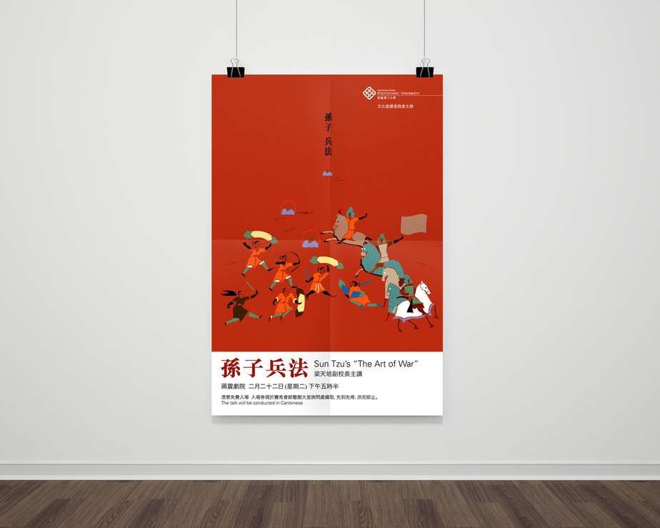 The poster was designed to portray a stylized fighting scene inspired by Sun Tzi’s strategic mindset. The goal was to create a visual that feels both culturally grounded and graphically bold, suitable for exhibition, educational use, or thematic branding.